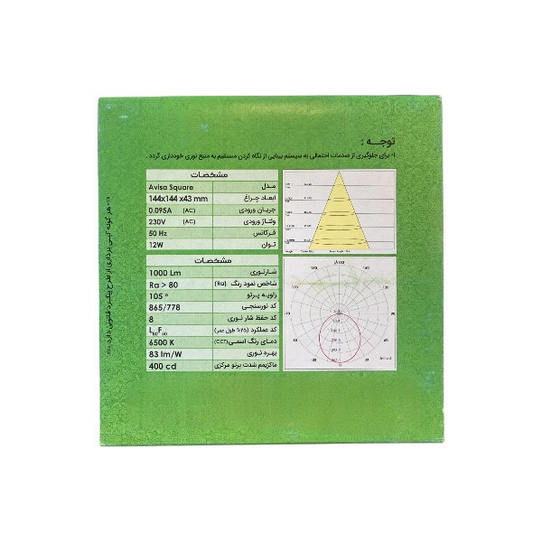 چراغ روکار آویسا 20 وات مربع پارس شعاع توس به صورت روکار نصب می شود و ابعاد آن *180*43*180 میلی متر می باشد.نوع لامپ به کار رفته در آن SMD LED می باشد علاوه بر این در محصول تراشه های SMD پشت نور چیده شده اند که به آن نور پس زمینه می گویند. لامپ ال ای دی سقفی شرکت پارس شعاع توس دارای ویژگی هایی از قبیل زاویه تابش 110 درجه، شاخص نمود رنگ Ra>80، جنس بدنه پلیمر فرآوری شده، درایور داخلی (ِDOB) و دیفیوزر پلی کربنات می باشد. یکی دیگر از ویژگی های این چراغ با توان 20 وات خود قادر به تولید میزان نور 4700 لومن است که مقدار کافی و مناسبی می باشد .