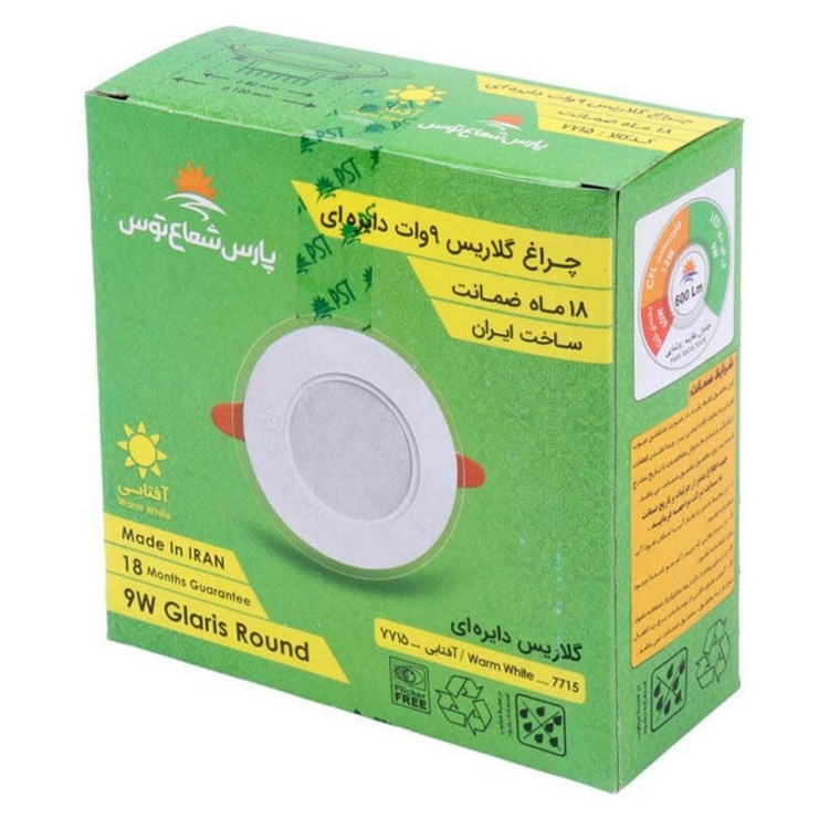 چراغهای سقفی برند 9 وات در سه تنوع رنگی سفید، آفتابی و سفید آفتابی (نور طبیعی یا یخی) قابل خرید توسط مشتریان عزیز است. این چراغها تولید برند معتبر پارس شعاع توس هستند. عمر بالا و عدم افت نوردهی در مدت زمان طولانی همچنین روشنایی بی نظیر از ویژگیهای این چراغ سقفی میباشد.