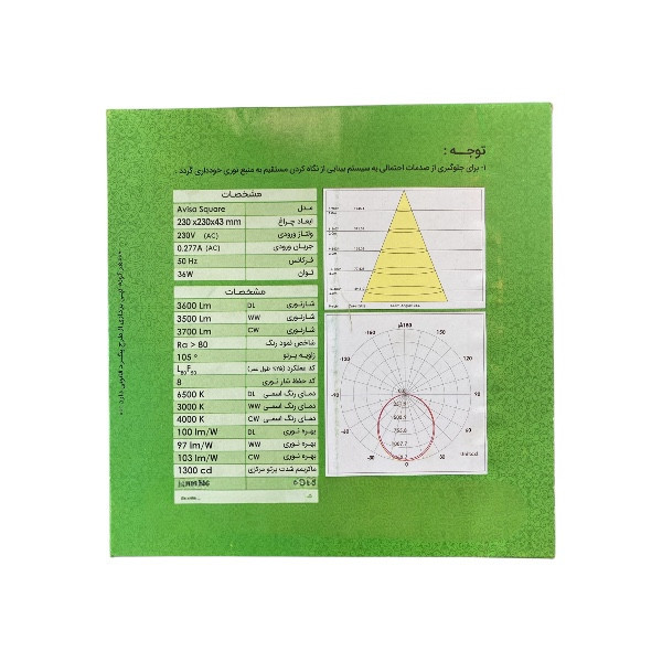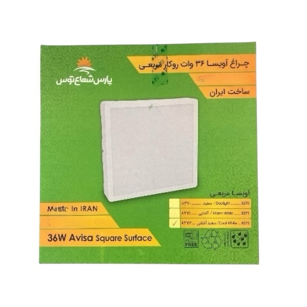 چراغ روکار آویسا 36 وات دایره ای پارس شعاع توس به صورت روکار نصب می شود و ابعاد آن 230*43 *230میلی متر می باشد.نوع لامپ به کار رفته در آن SMD LED می باشد علاوه بر این در محصول تراشه های SMD پشت نور چیده شده اند که به آن نور پس زمینه می گویند. لامپ ال ای دی سقفی شرکت پارس شعاع توس دارای ویژگی هایی از قبیل زاویه تابش 110 درجه، شاخص نمود رنگ Ra>80، جنس بدنه پلیمر فرآوری شده، درایور داخلی (ِDOB) و دیفیوزر پلی کربنات می باشد. یکی دیگر از ویژگی های این چراغ با توان 36 وات خود قادر به تولید میزان نور 4700 لومن است که مقدار کافی و مناسبی می باشد .