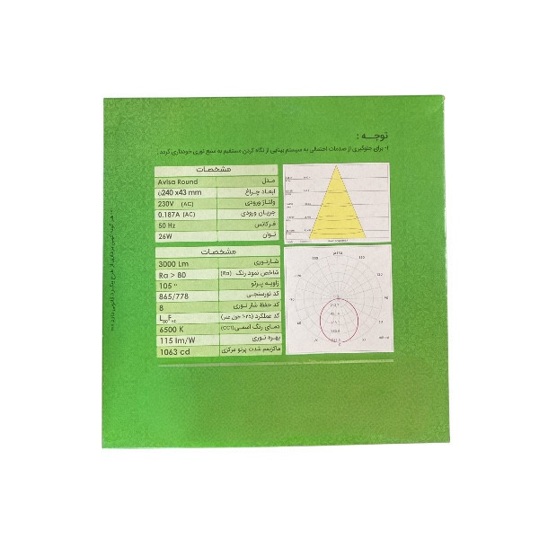 چراغ روکار آویسا 20وات دایره ای پارس شعاع توس به صورت روکار نصب می شود و ابعاد آن 240*۴3 میلی متر می باشد.نوع لامپ به کار رفته در آن SMD LED می باشد علاوه بر این در محصول تراشه های SMD پشت نور چیده شده اند که به آن نور پس زمینه می گویند. لامپ ال ای دی سقفی شرکت پارس شعاع توس دارای ویژگی هایی از قبیل زاویه تابش 110 درجه، شاخص نمود رنگ Ra>80، جنس بدنه پلیمر فرآوری شده، درایور داخلی (ِDOB) و دیفیوزر پلی کربنات می باشد. یکی دیگر از ویژگی های این چراغ با توان 20 وات خود قادر به تولید میزان نور 4700 لومن است که مقدار کافی و مناسبی می باشد .
