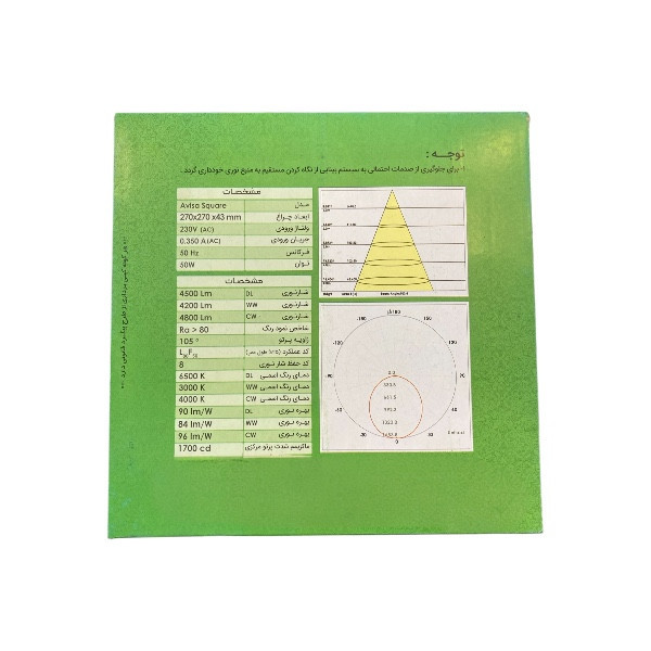 چراغ روکار آویسا 50 وات دایره ای پارس شعاع توس به صورت روکار نصب می شود و ابعاد آن 270*43*270 میلی متر می باشد.نوع لامپ به کار رفته در آن SMD LED می باشد علاوه بر این در محصول تراشه های SMD پشت نور چیده شده اند که به آن نور پس زمینه می گویند. لامپ ال ای دی سقفی شرکت پارس شعاع توس دارای ویژگی هایی از قبیل زاویه تابش 110 درجه، شاخص نمود رنگ Ra>80، جنس بدنه پلیمر فرآوری شده، درایور داخلی (ِDOB) و دیفیوزر پلی کربنات می باشد. یکی دیگر از ویژگی های این چراغ با توان 50 وات خود قادر به تولید میزان نور 4700 لومن است که مقدار کافی و مناسبی می باشد .