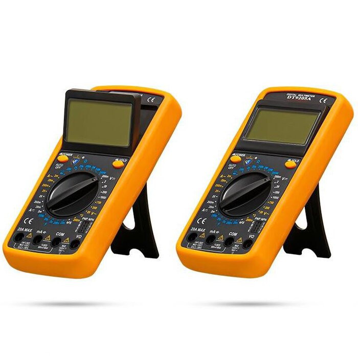 مولتی متر دیجیتال (DMM) یک ابزار آزمایشی است که برای اندازه گیری دو یا چند مقدار الکتریکی، عمدتاً ولتاژ (ولت)، جریان (آمپر)، و مقاومت (اهم) استفاده می شود. این یک ابزار تشخیص استاندارد برای تکنسین های برق/الکترونیک است. اندازهگیری ولتاژ، مقاومت و جریان بدون ابزار مناسب کار آسانی نیست، مولتی متر DT9205A یک ابزار دیجیتال و دقیق برای این کار میباشد. مشخصات فنی مولتیمتر DT9205A برند امپایر : دامنه اندازهگیری ولتاژ DC : از 200mV تا 1000V دامنه اندازهگیری ولتاژ AC : از 200mV تا 750V دامنه اندازهگیری خازن 20 نانو فاراد تا 200 میکرو دامنه اندازهگیری مقاومت از 200 اهم تا 200 مگا اهم بیزر دار، صفحه نمایشگر متحرک، قابلیت تست ترانزیستور مولتیمتر امپایر به همراه کاور محافظ و باطری 9 ولت