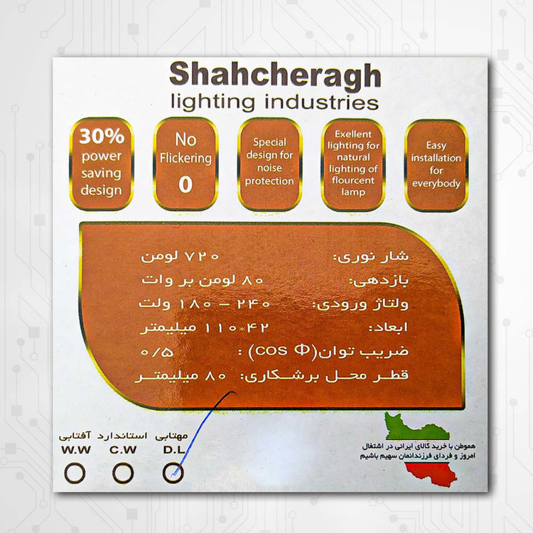 چراغ هالوژن طرح روناک مدل شاهچراغ در رنگ های مختلف عرضه میشود این چراغ هالوژن با برچسب انرژی A+ گزینه کم مصرف و مناسبی برای استفاده روز مره است قطر فنر تا فنر محصول 80mm می باشد (سایز برش) امتیاز عالی این محصول نسبت به سایر کالا های مشابه بی کیفیت و جود هیت سینک آلومینیوم به جای پلاستیک است که محصول رو در برابر گرمای و آسیب مقاوم میکند. محصولاتی که هیت سینک آلومینیوم ندارند معمولا دارای قیمت پایین تر هستند، عمر واقعی خود را طی نمی کنند و پس از مدت کوتاهی به دلیل دمای بالا محصول نور خود را از دست میدهند و از بین می روند. این محصول دارای فنری قدرتمند و با کیفیت هستند بهترین مکان مناسب برای این چراغ هالوژن سقف هایی با ارتفاع 2 و نیم تا 3 متر هستند تا نور بیشتری به محیط برسد در غیر این صورت به تعداد بیشتری از این محصول نیاز دارید این محصول مناسب انواع مکان های تجاری و مسکونی است