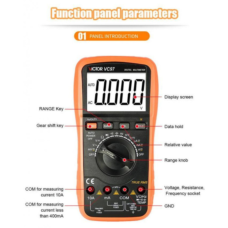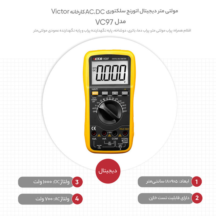 مولتی متر دیجیتال اتورنج سلکتوری AC،DC مدل VC97 کارخانه Victor جزء یکی از کاربردی ترین و اصلی ترین تجهیزات دقیق تست و اندازه گیری جهت تعمیرات، تولید و راه اندازی در آموزشگاه ها، آزمایشگاه ها، صنایع، کارخانجات، کارگاه های تولیدی و تعمیرگاه های برق و الکترونیک محسوب میشود و از طریق آن میتوان ولتاژ، جریان، مقاومت الکتریکی، ظرفیت خازنی، فرکانس و دما را اندازه گیری نمود.