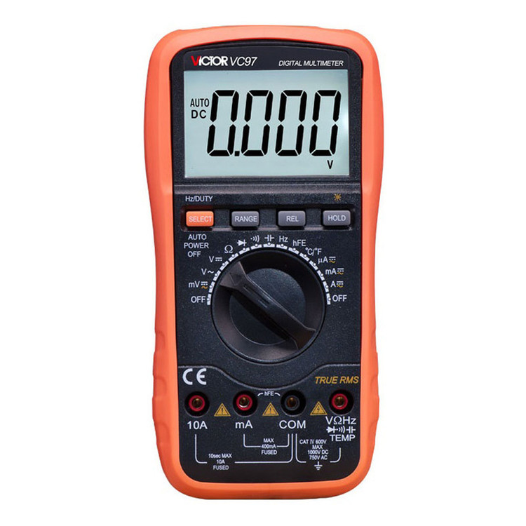 مولتی متر دیجیتال اتورنج سلکتوری AC،DC مدل VC97 کارخانه Victor جزء یکی از کاربردی ترین و اصلی ترین تجهیزات دقیق تست و اندازه گیری جهت تعمیرات، تولید و راه اندازی در آموزشگاه ها، آزمایشگاه ها، صنایع، کارخانجات، کارگاه های تولیدی و تعمیرگاه های برق و الکترونیک محسوب میشود و از طریق آن میتوان ولتاژ، جریان، مقاومت الکتریکی، ظرفیت خازنی، فرکانس و دما را اندازه گیری نمود.