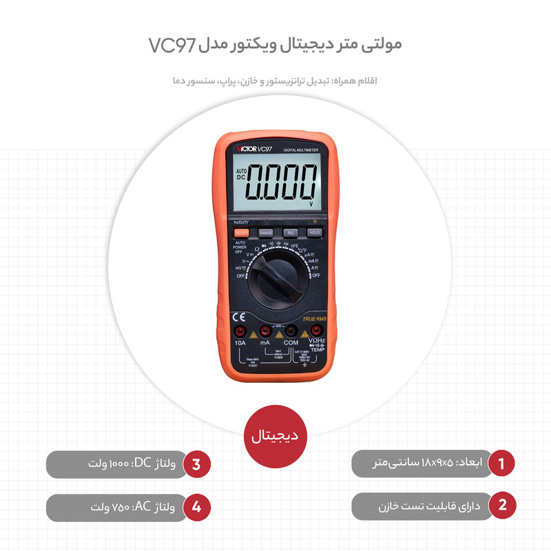 مولتی متر دیجیتال اتورنج سلکتوری AC،DC مدل VC97 کارخانه Victor جزء یکی از کاربردی ترین و اصلی ترین تجهیزات دقیق تست و اندازه گیری جهت تعمیرات، تولید و راه اندازی در آموزشگاه ها، آزمایشگاه ها، صنایع، کارخانجات، کارگاه های تولیدی و تعمیرگاه های برق و الکترونیک محسوب میشود و از طریق آن میتوان ولتاژ، جریان، مقاومت الکتریکی، ظرفیت خازنی، فرکانس و دما را اندازه گیری نمود.